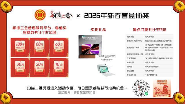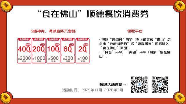 会上,顺德区委宣传部副部长、区文广旅体局副局长吴庆强示意,省文化和旅游厅“请到广东过大年”文旅蚀本惠民补贴行径已于2025年12月26日留意出手,第一阶段握续至2026年1月22日;第二阶段将从2026年1月23日延续到3月31日,共计2000万元的文旅蚀本券将连接披发,掩饰景区门票、旅舍住宿、文艺上演、旅游理会等全品类,过年时辰市民旅客可平淡使用。同期,顺德针对新春蚀本场景,策动了好意思食、家电、手机数码等多个限制的蚀本券散刊行径,节前斡旋投放,节中追加额度,确保福利不中断。