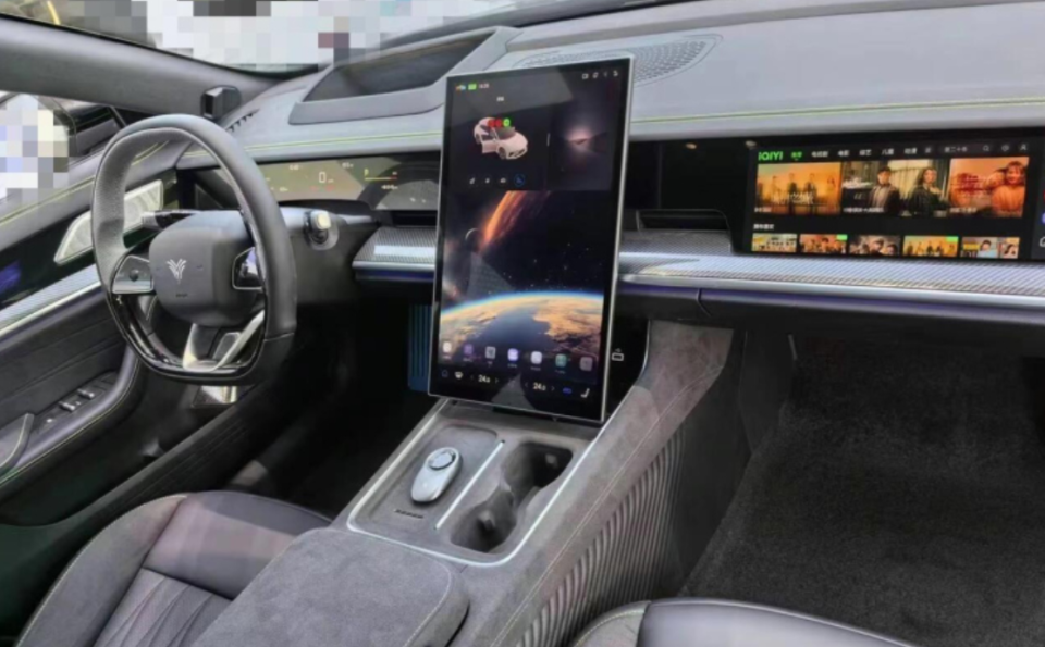 车内科技氛围很到位,总共中控台面上基本就被屏幕遮掩,罢了了四屏联动,驾驶员正前列就稀有字液晶仪容和大尺寸昂首流露投影,副驾驶一侧则是尺寸更大的单独文娱屏幕。竖屏布局的中控缱绻大屏幕尺寸很有视觉震荡。细节用料方面禁受了大齐的翻毛皮,这也能进一步突显指令氛围。