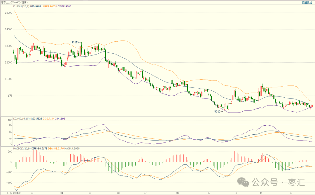 红枣主力CJ2505合约,盘面最高价9500元/吨,最廉价9305元/吨,收盘9450元/吨,较上一往翌日结算价飞腾190元/吨,执仓量102775(-1632)手,成交量90967手,盘面高开高走收阳线。MACD红色能量柱缩量,狡计在零轴下方粘合。